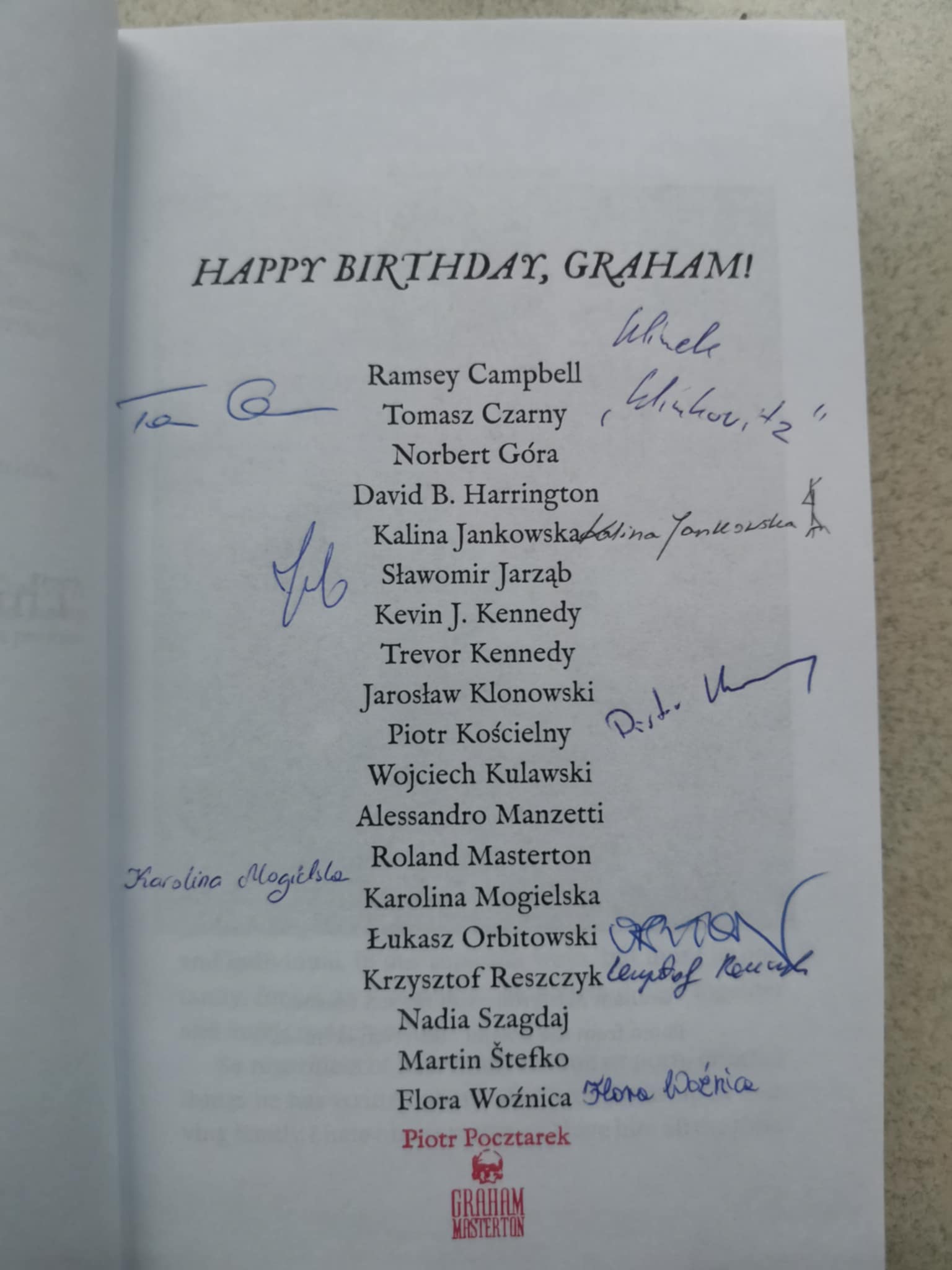 16 stycznia Graham Masterton obchodził okrągłe, 80 urodziny celebrowane na Zamku w Otmuchowie. Z tej okazji autor otrzymał pamiątkowe wydanie antologii opowiadań i wspomnień „Eighty Candles, One Shadow”, przygotowanej przez Wydawnictwo Lingua Mortis, któremu szefuje Sławomir Jarząb.